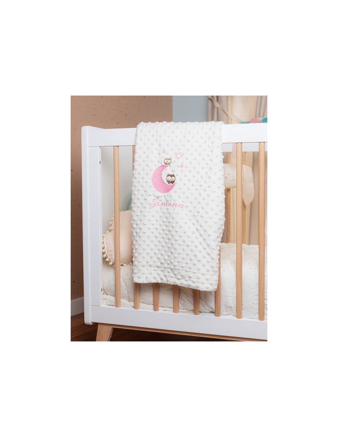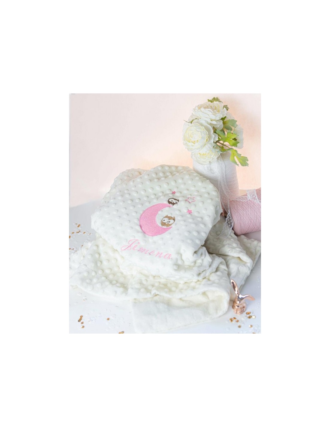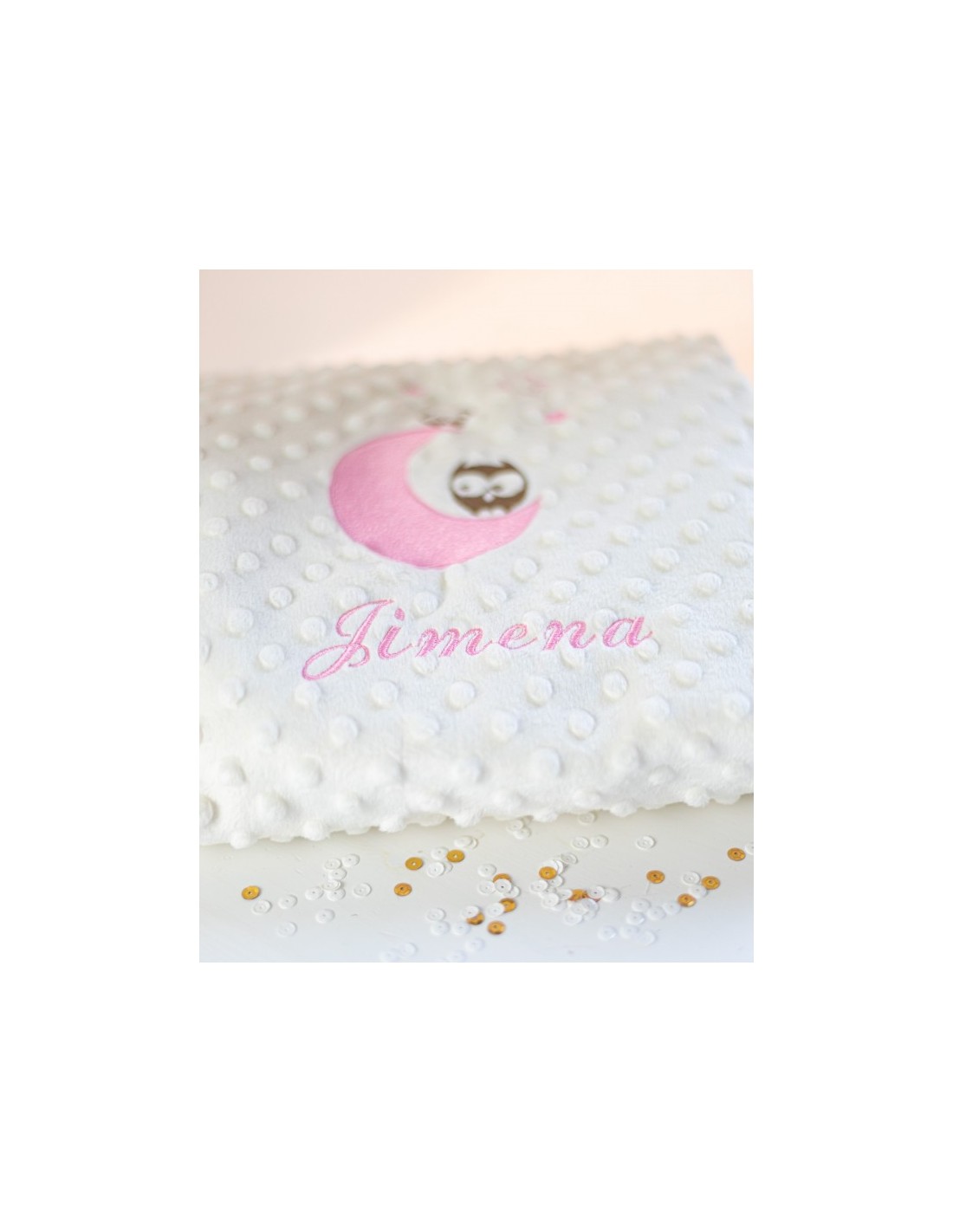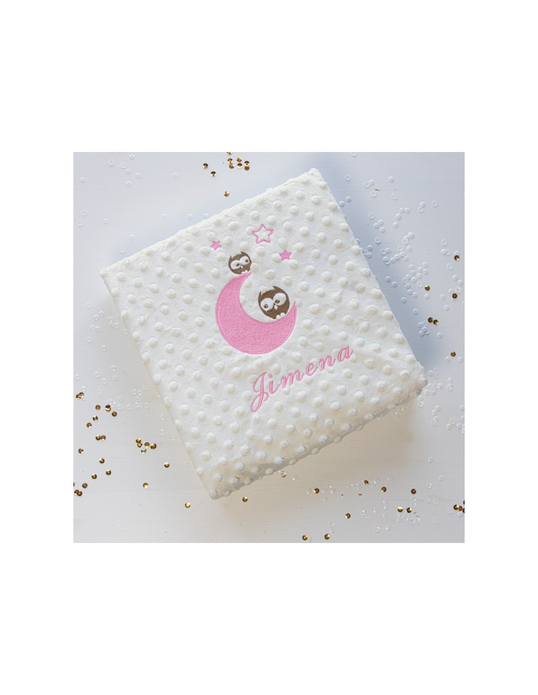 Manta infantil con bordado de buhos y personalizada con el nombre que tú quieras .