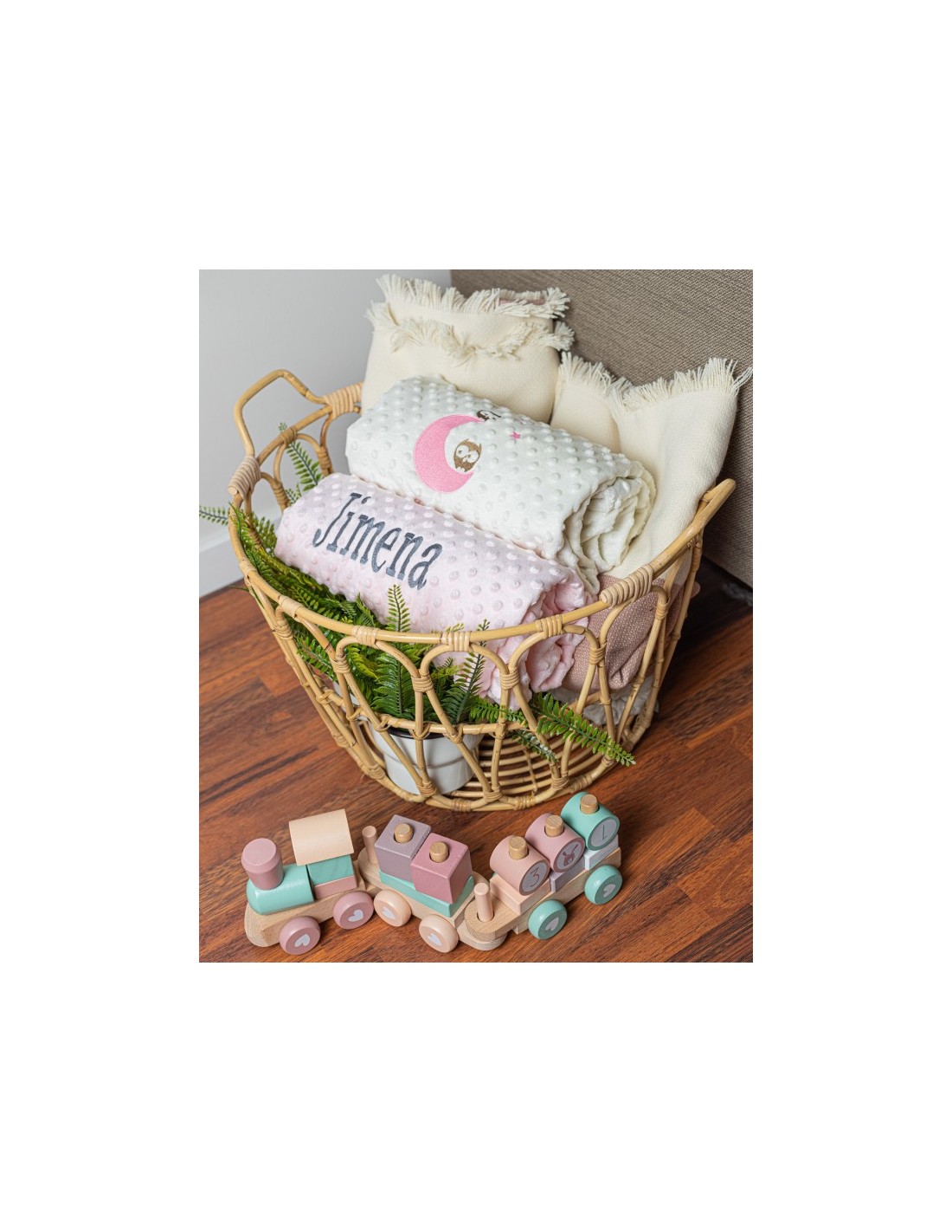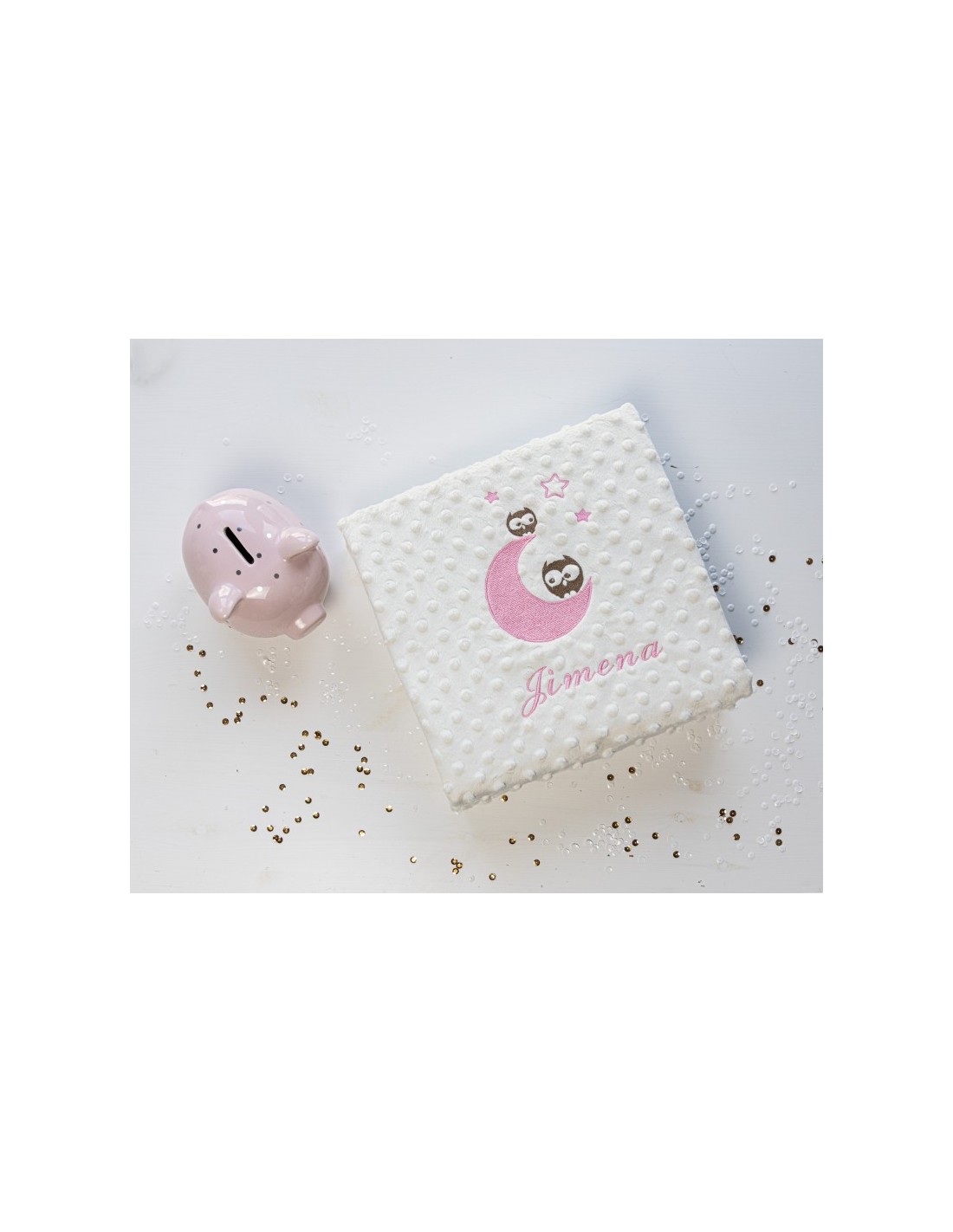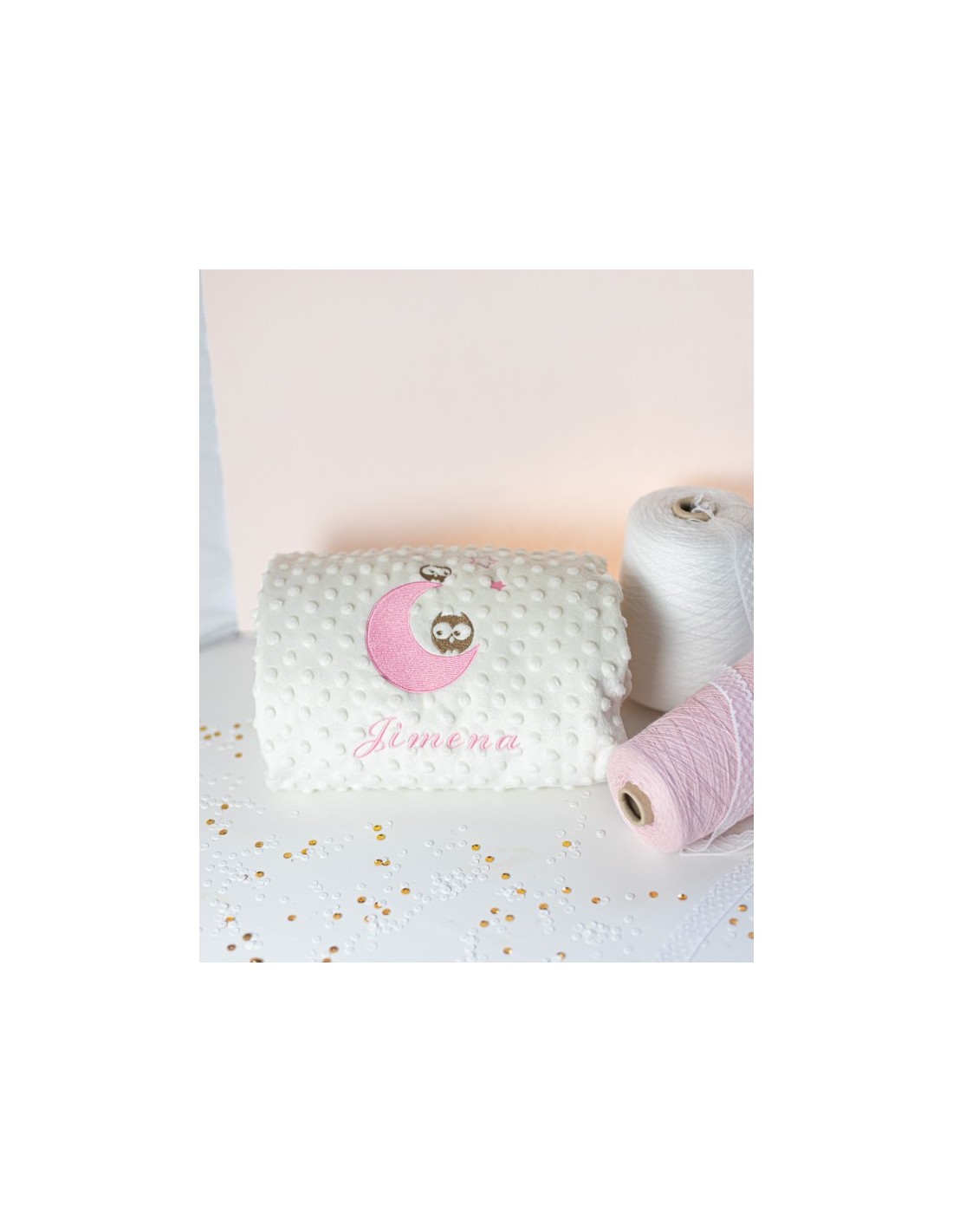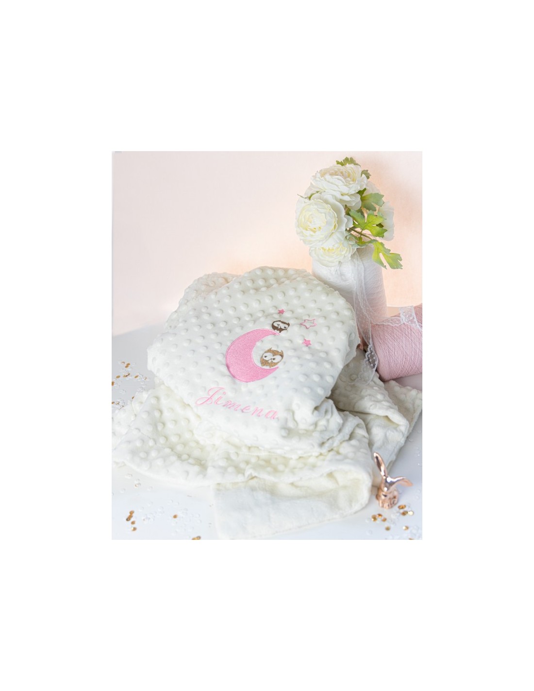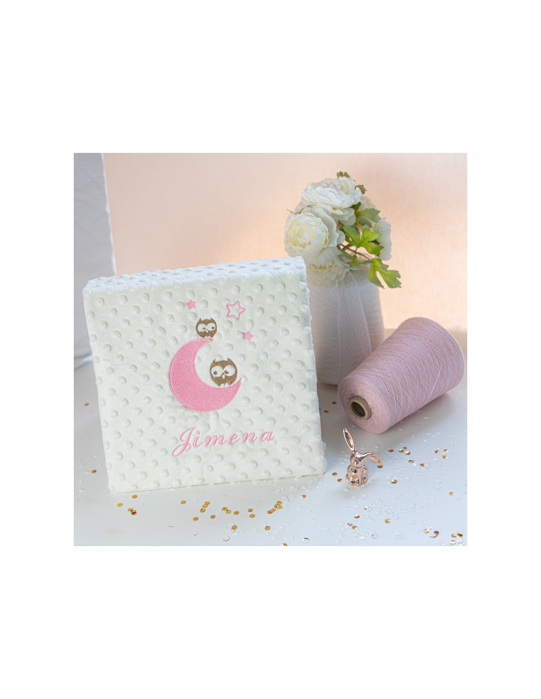 Manta infantil con bordado de buhos y personalizada con el nombre que tú quieras .